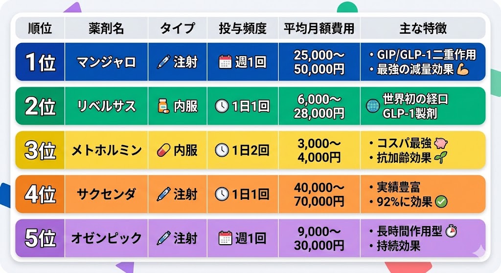 1位のマンジャロは、GIP/GLP-1の二重作用により最強の体重減少効果を発揮しますが、月額25,000〜50,000円と費用は高めです。大幅な減量を目指す方や、確実な効果を求める方に最適な選択肢です。