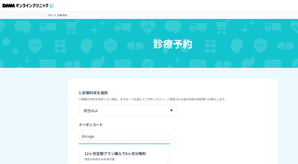 DMMオンラインクリニックのサイトに飛んだら,公式サイトのクーポンコードの箇所をクリックすると、クーポンコードがコピーされるのでそのまま診療予約に進み、診療予約のクーポンコードの入力項目にコピペしたコードを貼り付けて下さい。